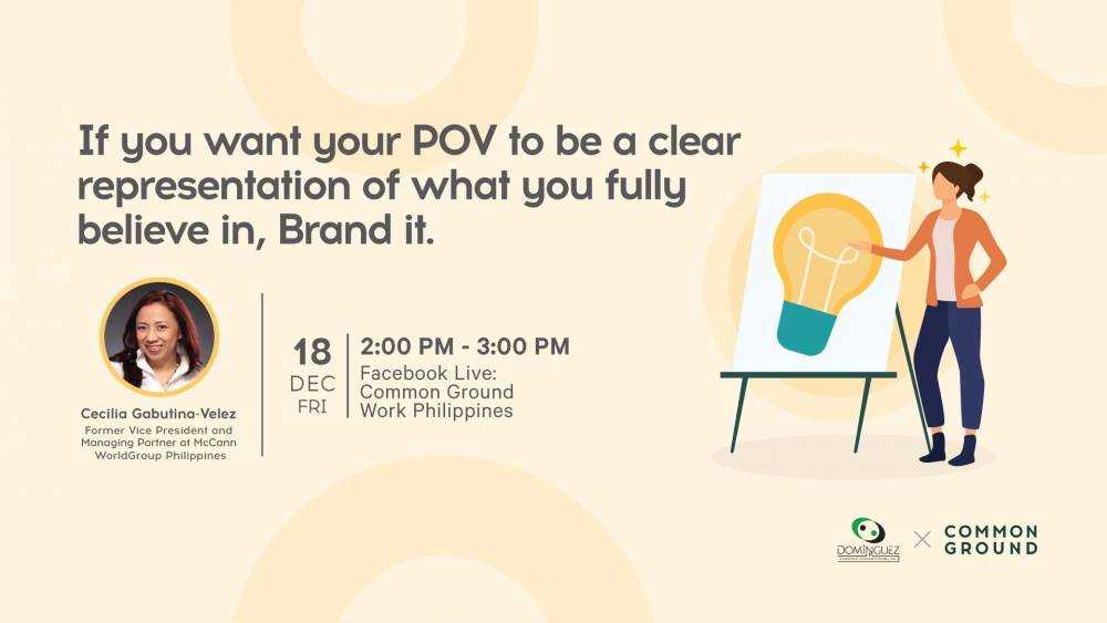 As part of a strategic partnership, Common Ground, one of the country’s leading provider of co-working space and Dominguez Marketing Communications Inc, one of the country’s most respected PR agency announced its first ever organized webinar, entitled, “Branding Your Idea.” This free webinar will happen on 18 December 2020, Friday, and will feature Cecile Gabutina-Velez, former managing partner at McCann WorldGroup Philippines.
