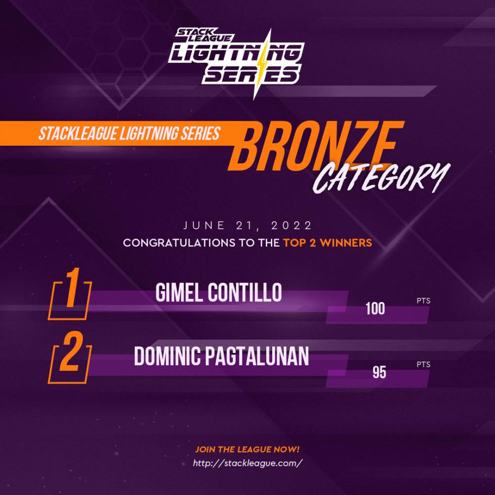 Last June 21, 2022 the Lightning Series for the Bronze Tier challengers was held. A PHP1200 cash prize awaits for the Top 2 winners of the series. The event was live streamed through StackLeague’s official youtube account wherein live rankings for the competition was displayed. Different questions were needed to be answered by the challengers wherein they will earn points. Rankings were determined through the points earned all through the event proper. Participants had 1hr to complete all of the challenges and win the competition.