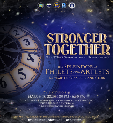 The UST Faculty of Arts & Letters is inviting all its alumni members to join this year’s exciting and much anticipated face to face alumni event, Stronger Together, the UST AB Grand Alumni Homecoming. This will be held on March 18, 2023 (Saturday) from 1-6PM at the historic Kalayaan Hall of Club Filipino in Greenhills, San Juan City.