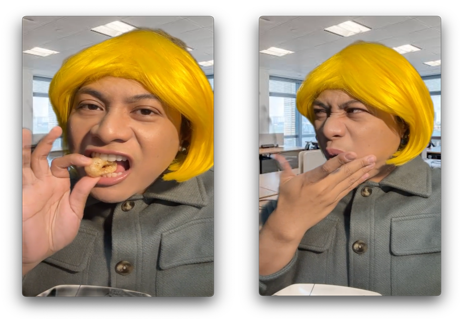 MacoyDubs through his CEO persona, Lisa B., showed how one can begin to have difficulty in biting and chewing into hard, crunchy foods as they age.