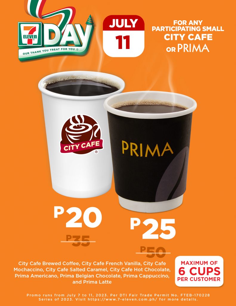 Apart from the price markdowns on its grocery items, 7-Eleven is also slashing off prices from its in-house food classics.. Every order of one-piece Crunch Time Chicken will be sold at P10 off from July 6 to 11; City Cafe and Prima coffee selections in small cups are at P20 off on Jul 11; all variants of Big Bite Hotdog will only ring at the till for P23 on July 11; and the different flavors of the 7-Fresh Siopao – pancit crab, adobo, asado, and bola-bola – will have P6 discount on July 11 as well.
