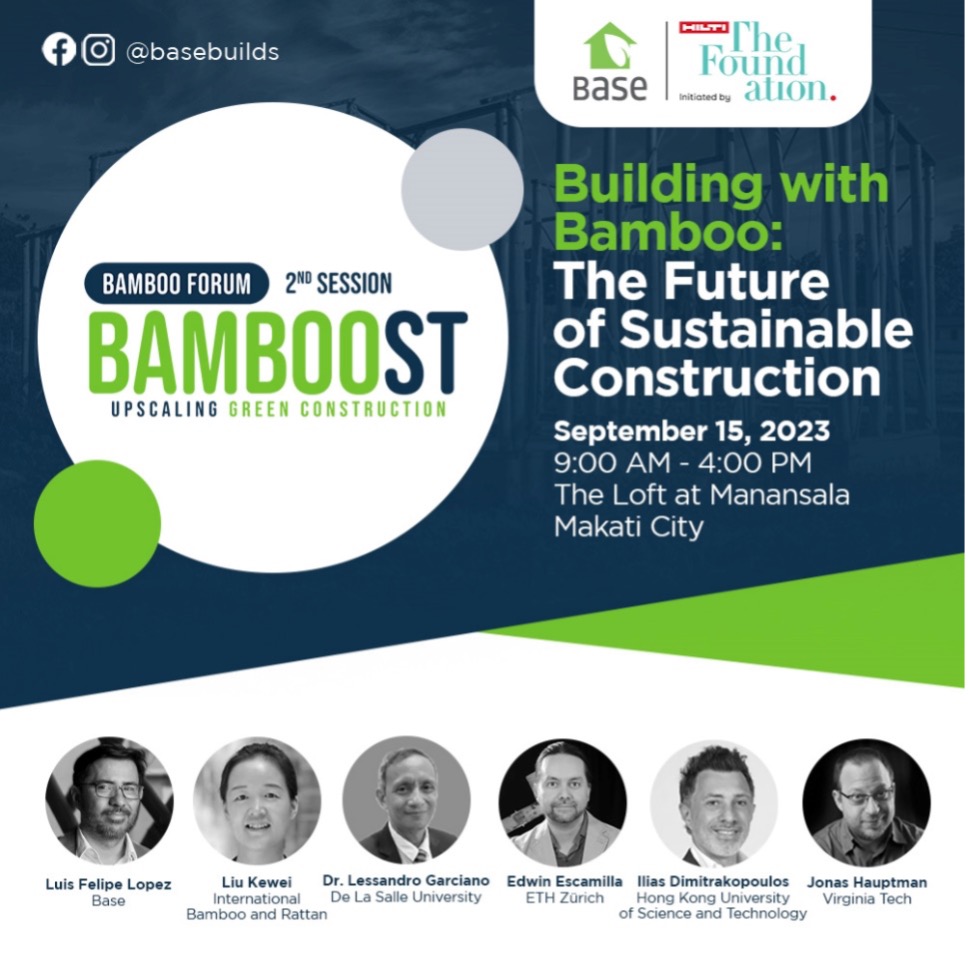 Luis Lopez, Base Head of Technology, leads an international roster of speakers on sustainable construction with bamboo that includes Jonas Hauptman who co-leads the VT BioDesign Research Group and is an Associate Professor of Industrial Design at Virginia Tech, United States; Dr. Edwin Escamilla, Chair for Sustainable Construction with ETH Zurich; Ilias Dimitrakopolous, Assistant Professor with the Department of Civil and Environmental Engineering in Hong Kong University of Science and Technology (HKUST); Liu Kewei, Global Bamboo Construction Programme Coordinator of International Bamboo and Rattan Organisation (INBAR); and Dr. Lessandro Garciano, Associate Professor in Civil Engineering at De La Salle University Manila.