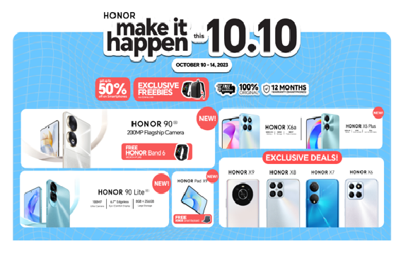 So what are you waiting for, head on to HONOR’s official online stores at Shopee (bit.ly/HONORxShopeeMakeItHappenThis1010), Lazada (bit.ly/HONORxLazadaMakeItHappenThis1010), and TikTok (bit.ly/HONORxTiktokMakeItHappenThis1010) to know more about their exciting deals.