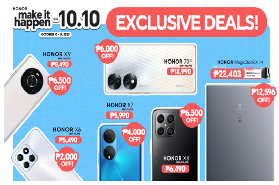 If you’ve been itching to upgrade your devices, now is the time. Get over Php 10K discount on HONOR products this 10.10 Sale, just head on to Shopee (bit.ly/HONORxShopeeMakeItHappenThis1010), Lazada (bit.ly/HONORxLazadaMakeItHappenThis1010), and TikTok Shop (bit.ly/HONORxTiktokMakeItHappenThis1010) from October 10 to 14, 2023!