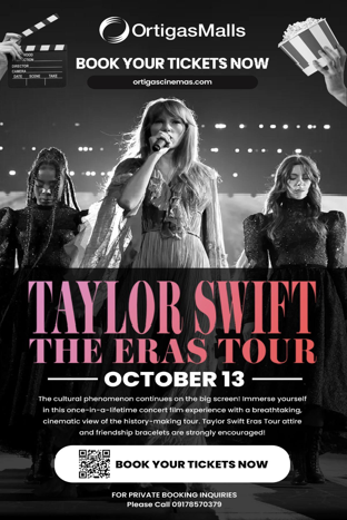You don’t need to fly abroad to experience Taylor Swift’s history-making The Eras Tour. Ortigas Malls is making Swifties’ “Wildest Dreams” come true with the premiere of Taylor Swift: The Eras Tour Film at Ortigas Cinemas on October 13, 2023, in Estancia Mall, Pasig City.