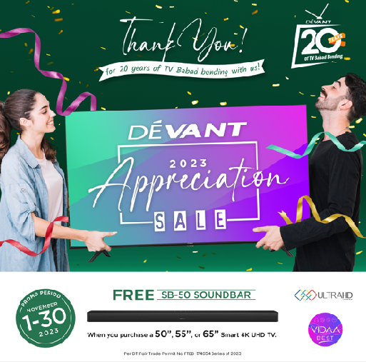 During the promo period, customers can purchase a Devant UHD204 SMART 4K TV for as low as PhP18,850 and get the SB-50 Soundbar for free. With Devant’s Thanksgiving offering for customers, family members – from the young ones to the elderly – will be able to create more vivid and colorful memories of holidays spent at home.