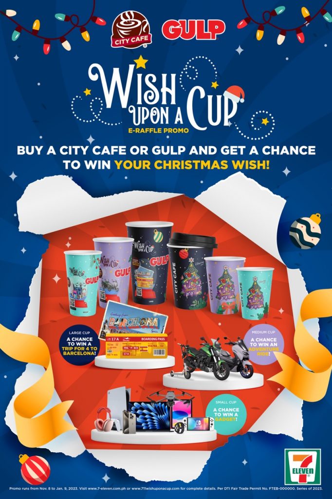 Once again, the Philippines’ leading neighborhood convenience store, 7-Eleven, is set to amp up the holiday cheers and turn Christmas dreams into reality with the “Wish Upon A Cup”raffle promo. From November 15, 2023 to January 16, 2024, customers can savor the joy of Paskong Pinoy at 7-Eleven, and get the chance to win incredible prizes such as gadgets, adventure rides, and even a trip for four to Barcelona.