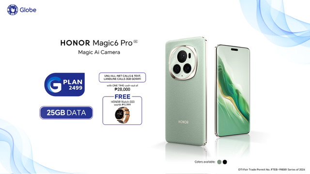 Leading global technology provider, HONOR, announced the availability of HONOR Magic6 Pro via Globe Plan for as low as Php 2,499 monthly with FREE HONOR Watch GS3 worth Php 11,999. The GPlan 2499 for HONOR Magic6 Pro comes with unli all-net calls and text, landline calls, and 3GB Go Wifi with a one-time payout for only Php 28,000.