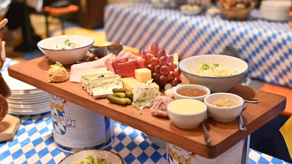 The menu features sausages like Rostbratwurst, a grilled and spicy pork sausage served alongside tangy sauerkraut, roasted potatoes, and rich onion jus, as well as Frankfurter sausage paired with creamy German potato salad and a freshly baked Kaiser roll. Indulge in the Oktoberfest Haxe or slow-roasted Pork Knuckle that comes with a wheat beer sauce that will leave you craving more. The Rindsgulasch is a hearty beef goulash made with braised beef ragout, served with bread dumplings and a side of red cabbage. The dessert station includes Apfelstrudel or classic apple strudel, Kaiserschmarrn or shredded caramelized pancake, and Schwarzwälder Kirschtorte or black forest gateau. These German delicacies offer an enchanting experience for families to savor.