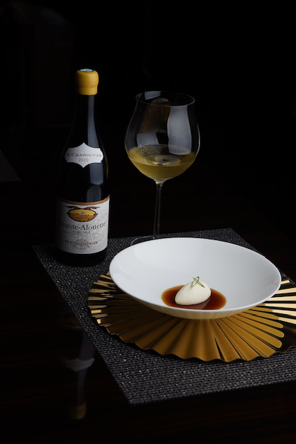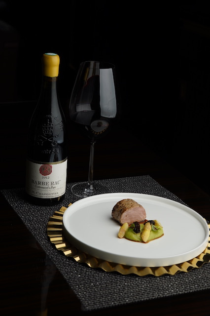 The decadent and creamy chestnut risotto with duck liver sauce and cherry jus comes next paired with the Hermitage ‘Monier de la Sizeranne’, 2018, a round and elegant wine with concentrated and gentle tannins. Revel on a classic roasted pork tenderloin with herb mashed potato and white asparagus, complemented by the Châteauneuf-du-Pape ‘Barbe Rac’, 2012, a wine that delivers pure fruit, with silky layers of raspberry, boysenberry, and blackberry coulis, bringing out the richness of the pork and complementing the creamy texture of the potatoes. For dessert, devour the luscious red wine pear with dark chocolate bauloisand vanilla ice cream. The Châteauneuf-du-Pape ‘La Bernardine’, 2021 and its deep, bold flavors is the perfect pair tothe dark chocolate and enhances the taste of the pear. Thismakes it a sweet and memorable finish to a luxurious meal.