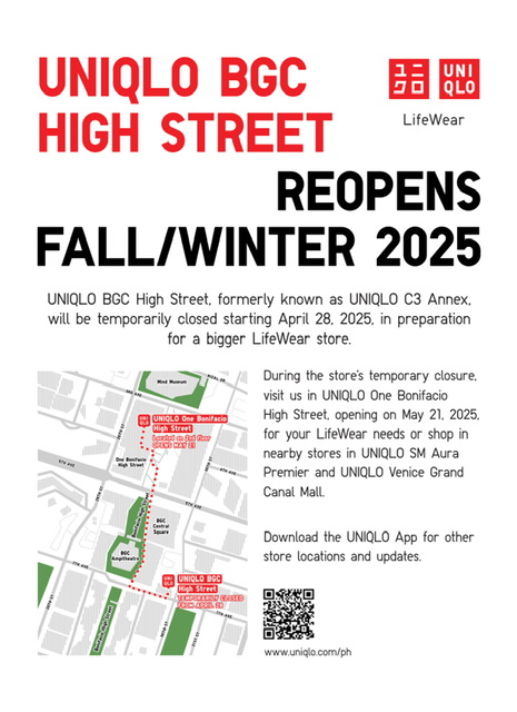In the meantime, shoppers can head to the temporary UNIQLO store in One Bonifacio High Street. Located on the second floor of the mall, the pop-up space will open on May 21, with the occasion marked with special deals and exclusive novelties promotions.