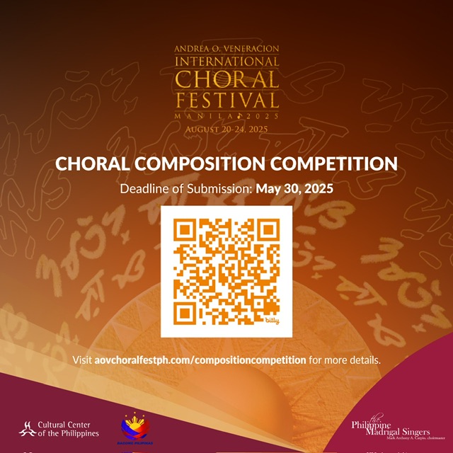 The Andrea O. Veneracion International Choral Festival (AOVICF) is now accepting entries for the first ever AOVICF Choral Composition Competition until May 30, 2025, at 11:59 PM (GMT+8).