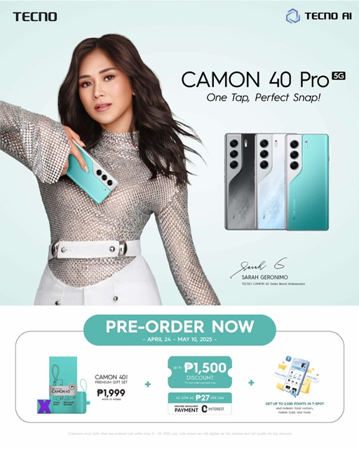 Pre-order the CAMON 40 Pro 5G until this May 10 in all TECNO offline stores and receive exclusive discounts and a CAMON premium gift set. The claiming period is from May 11 to 25, 2025.