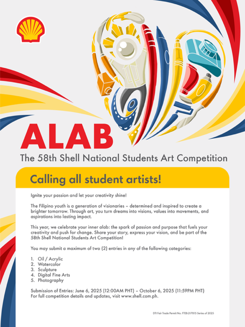 Shell PilipinasCorporation officially opens the call for entries to the 58th Shell National Students Art Competition (NSAC), inviting college students nationwide to showcase their creativity under this year’s theme: “ALAB”. Beginning June 6, young Filipino artists are encouraged to submit works expressing their convictions, cultural reflections, and emotional truths that fuel their creative fire.