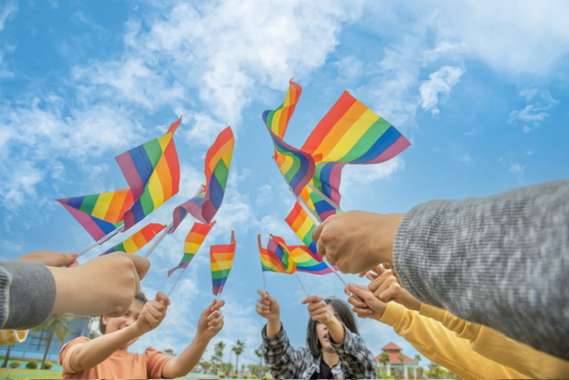 Diversity people hands raising colorful lgbtq rainbow flags together , a symbol for the LGBT community ,selective focus.concept LGBTQ community equal movement parade ,LGBTQ pride month.