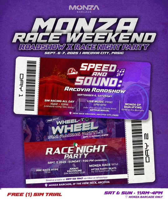 ● Saturday: Feel the heat at the Arcovia Roadshow — all-day sim racing (10AM–10PM), plus a FREE live music lineup featuring Arthur Miguel, Fitz Shioda, Frizzle Anne & Julie from 5–9PM at the View Deck Grounds.