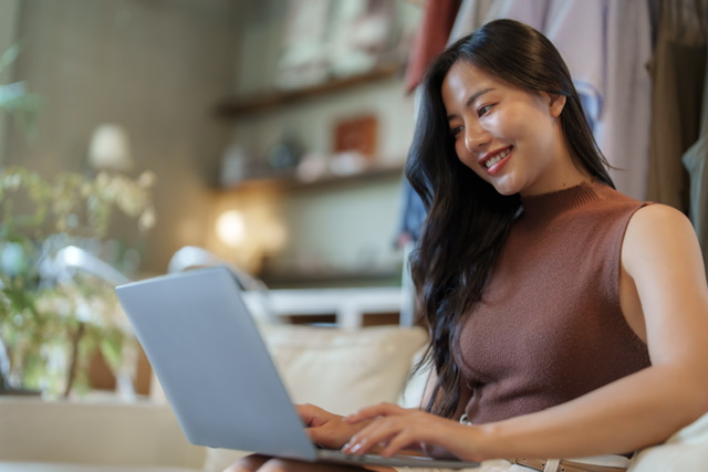 Young asian woman using laptop and working remotely from home, enjoying flexible work arrangement