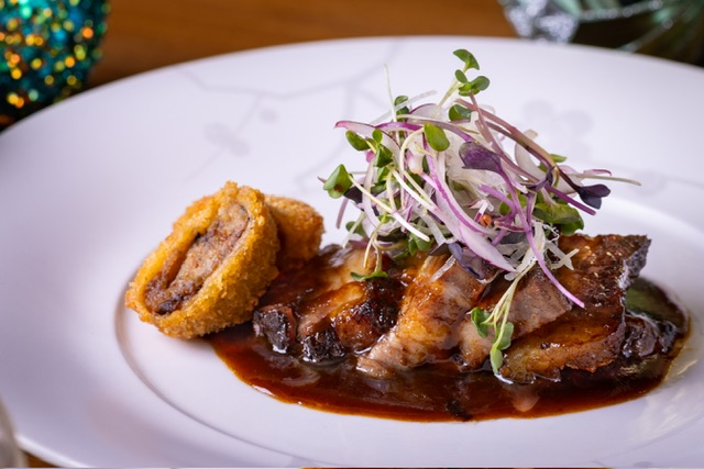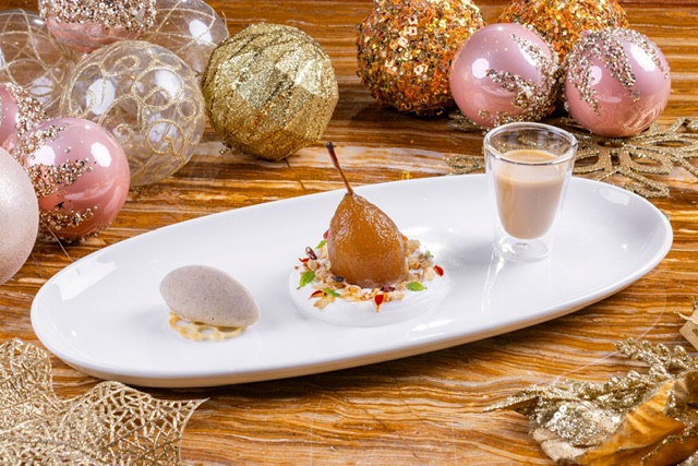 Whet the appetite with the Tuna Pistachio Ensalada (P1,200++), a medley of foie gras mousse, mesclun, prosciutto, caviar, beetroot puree, red radish, chicken skin, and kiat—kiat dressing. For a heartwarming treat, choose the Potato Kastanyas Krema (P500++), a soulful combination of cauliflower and potato and leek soup with chickpea salsa, water chestnut, toasted cashew, and malunggay truffle oil. The Morcon Embotido (P1,550++) is not-to-be missed as the savory Filipino-style meatloaf wrapped pork loin with potato puree, pickled mustard seeds, chestnut, green apple, and morel pork jus is an indulgent Christmas treat. End the meal on a sweet note with the Peras and Kastanyas (P400++), an ensemble of star anise-poached pear, chestnut sorbet, caramel sauce and pinipig crumble.