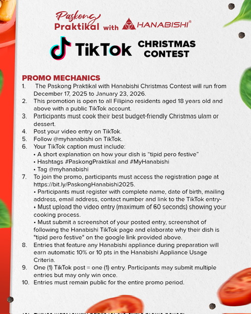Include a caption explaining how the dish is “tipid but festive.” Use the hashtags #PaskongPraktikal and #MyHanabishi. Videos must be a maximum of 60 seconds and should clearly show the cooking or preparation process.