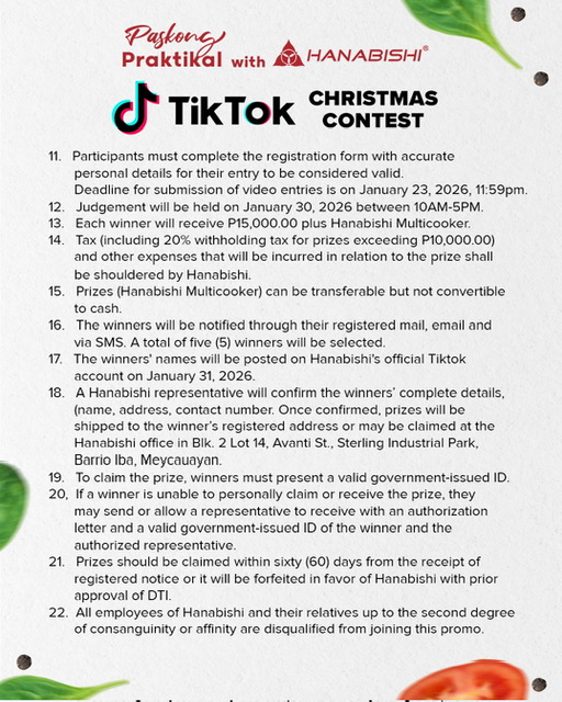 The deadline for the submission of entries to “Paskong Praktikal TikTok Challenge” is on January 23, 2026 at 11:59 PM. The judging will be held on January 30.