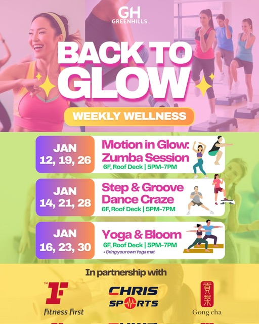 ● Motion in Glow (Zumba): Light up the 6F Roof Deck every Monday (January 12, 19, 26) from 5:00 PM to 7:00 PM.