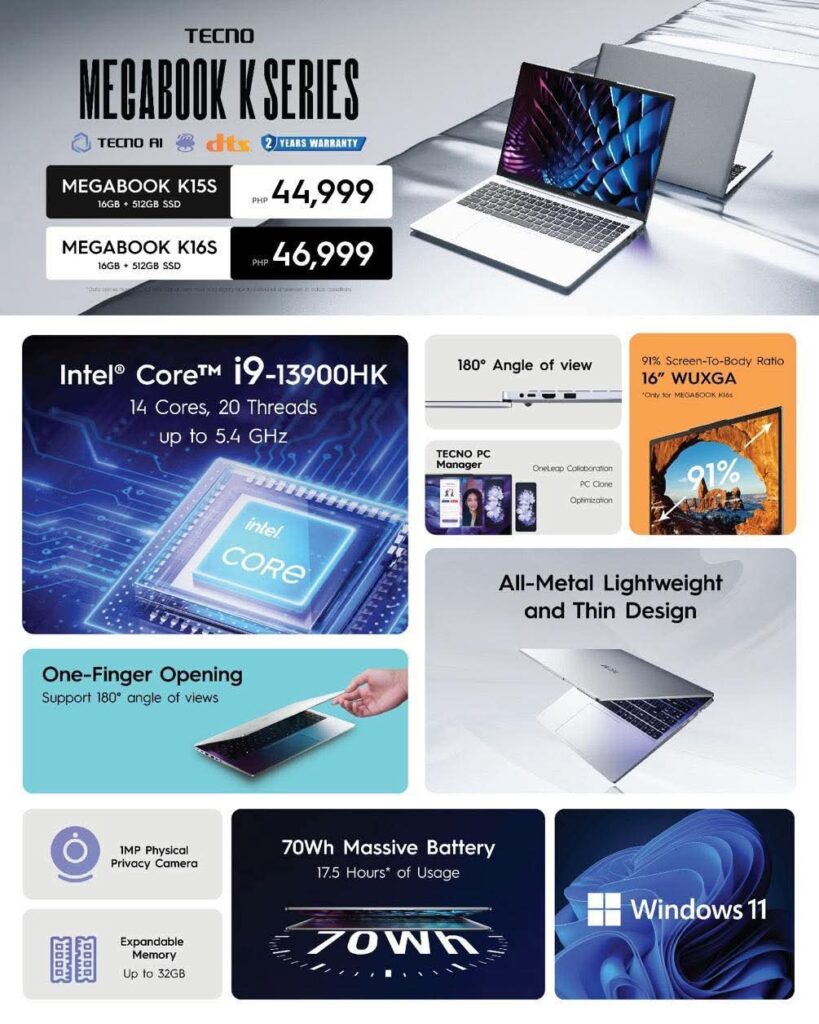 – Purchase the MEGABOOK K16s 13th (official price: ₱46,999) and also enjoy the “buy one get one free” offer, with the gift upgraded to a TECNO CAMON 40 Pro 5G 8GB RAM+256GB ROM.
