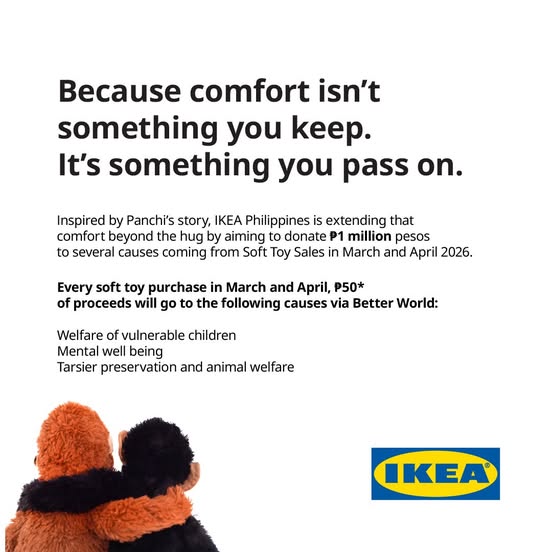 Introducing Project Panchi Akap Pabalik, an initiative that transforms a simple hug to meaningful impact. For March and April 2026, IKEA Philippines is aiming to donate up to ₱1 million from soft toy sales to support key social and environmental causes. For every soft toy purchased during the campaign period, ₱50 will go toward IKEA’s initiatives in partnership with Better World organization.
