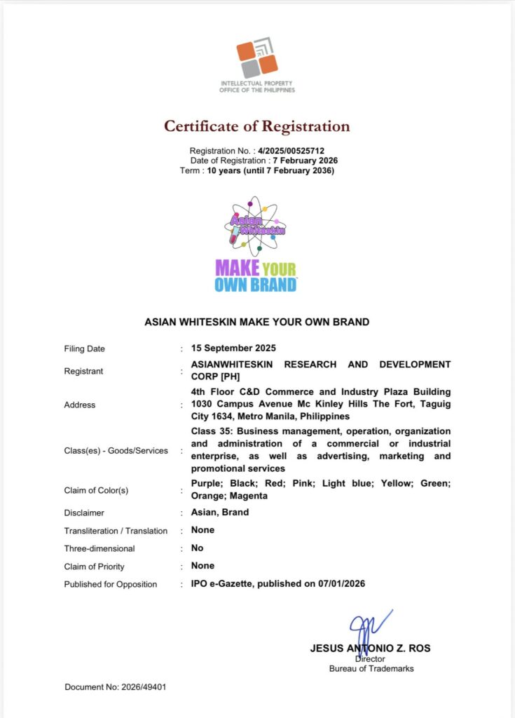 Asianwhiteskin Research & Development / Manufacturer announces the successful reclaiming of its tagline “Create Your Own Brand / Make Your Own Brand” as a registered trademark in the Philippines, with broader recognition including Japan. As a pioneer in the local food health and beauty supplements and skincare manufacturing space, Asianwhiteskinhas long championed brand customization and ownership, and this milestone reinforces its leadership in safeguarding intellectual property while supporting partners who seek to build their own brands.