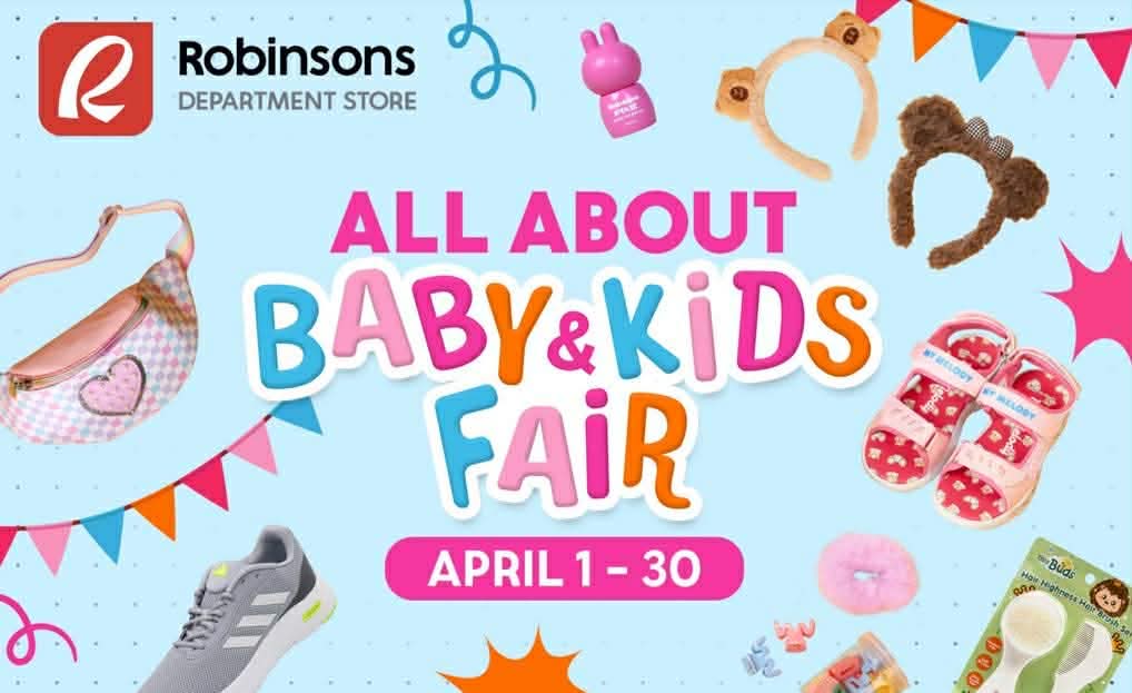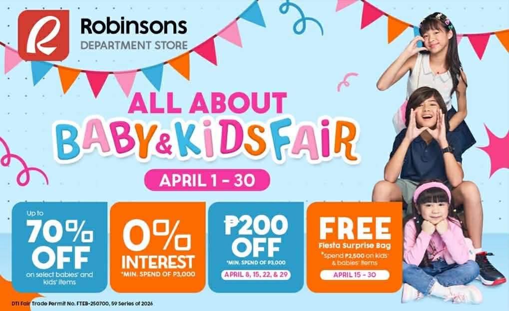Ready your shopping carts and don’t miss out on Robinsons Department Store’s All About Babies & Kids Fair this April, including a special activation at Robinsons Manila’s Midtown Atrium from April 14 to 20, 2026. Aside from discounts, Go Rewards members can enjoy an additional P200 off (minimum purchase of P3,000) on all Wednesdays of April. You can also take home a free Fiesta Surprise Bag for a minimum purchase of P2,500 on kids and babies items.